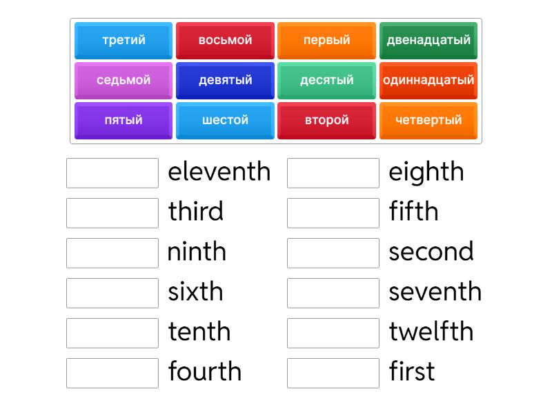 первый - first, второй - second, третий - third, четвертый - fourth, пятый - fifth, шестой - sixth, седьмой - seventh, восьмой - eighth, девятый - ninth, десятый - tenth, одиннадцатый - eleventh, двенадцатый - twelfth,