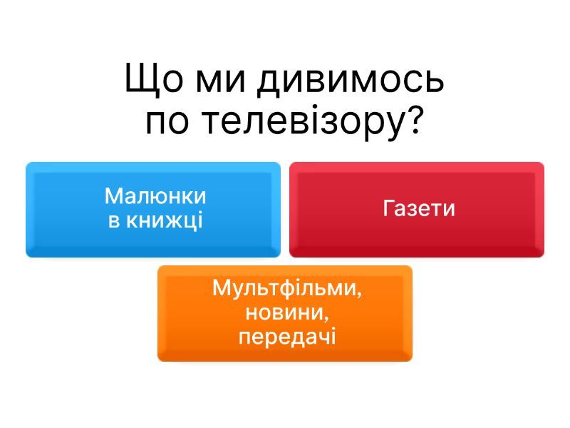 1) Що ми дивимось по телевізору? a) Малюнки в книжці b) Газети c) Мультфільми, новини, передачі 2) Де ми можемо читати новини в Інтернеті? a) На сайтах і у соцмережах b) На шкільній дошці c) У зошиті 3) Що ми можемо знайти в газеті? a) Казки про тварин b) Новини, рекламу, оголошення c) Мультфільм 4) Яке з наведеного є книгою? a) Телефон b) Зошит c) Казка з обкладинкою і сторінками 5) Для чого потрібні медіа? a) Щоб розважати, навчати, інформувати b) Щоб малювати c) Щоб готувати 6) Для чого потрібна медіаграмотність? a) Щоб слухати музику b) Щоб уміти розрізняти правду і неправду в медіа c) Не потрібна