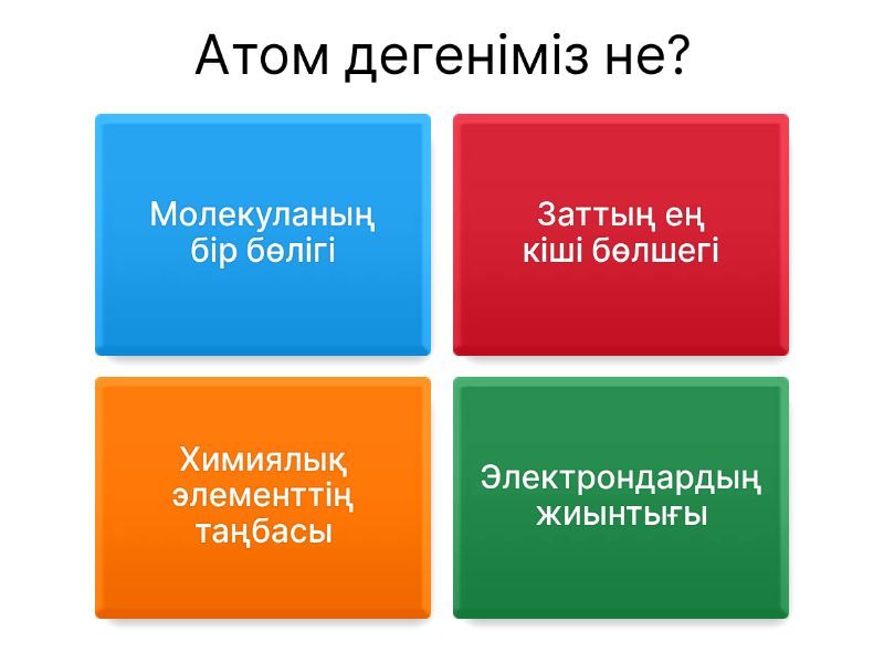 1) Атом дегеніміз не? a) Молекуланың бір бөлігі b) Заттың ең кіші бөлшегі c) Химиялық элементтің таңбасы d) Электрондардың жиынтығы 2) Атомның құрамына не кіреді? a) Электрод, ядро, плазма b) Электрон ғана c) Протон, нейтрон, электрон d) Молекула, ион, радикал 3) Атом ядросында қандай бөлшектер болады? a) Электрондар b) Протондар мен нейтрондар c) Нейтрино d) Фотондар 4) Электронның заряды қандай? a) Оң b) Бейтарап c) Екі есе оң d) Теріс 5) Атомдық масса нені білдіреді? a) Атомның жалпы массасын b) Химиялық элементтің таңбасын c) Электр зарядын d) Ядродағы электрон санын 6) Протонның заряды қандай? a) Теріс b) Оң c) Бейтарап d) Заряды жоқ 7) Нейтронның заряды қандай? a) Қос зарядталғаг b) Оң c) Бейтарап d) Теріс 8) Радиоактивтілік дегеніміз не? a) Атом ядросының өздігінен ыдырауы b) Атом ядросының тұрақты күйі c) Электрондардың қозғалуы d) Химиялық байланыс түзілуі 9) Радиоактивті элементтердің мысалы: a) Оттек b) Сутек c) Уран d) Көміртек 10) Радиоактивтілікті кім ашқан? a) А.Эйнштейн b) М. Кюри c) Г. Менделеев d) Э. Резерфорд 11) Альфа-бөлшек нені білдіреді? a) Протон мен электрон b) Тек электрон c) Гамма-сәуле d) 2 протон мен 2 нейтроннан тұратын бөлшек 12) Бета-бөлшек дегеніміз не? a) Электрон немесе позитрон b) Протон c) Нейтрон d) Гамма-сәуле 13) Гамма-сәулелену ерекшелігі: a) Зат бөлшегі b) Химиялық реакция өнімі c) Электромагниттік толқын d) Электр зарядталған бөлшектер 14) Атом нөмірі нені көрсетеді? a) Нейтрондар санын b) Электрондар мен протондар санын c) Молекула массасын d) Ядроның көлемін 15) Изотоптар дегеніміз не? a) Зарядтары бірдей иондар b) Электрон саны бірдей элементтер c) Молекула массасы бірдей элементтер d) Протон саны бірдей, нейтрон саны әртүрлі элементтер