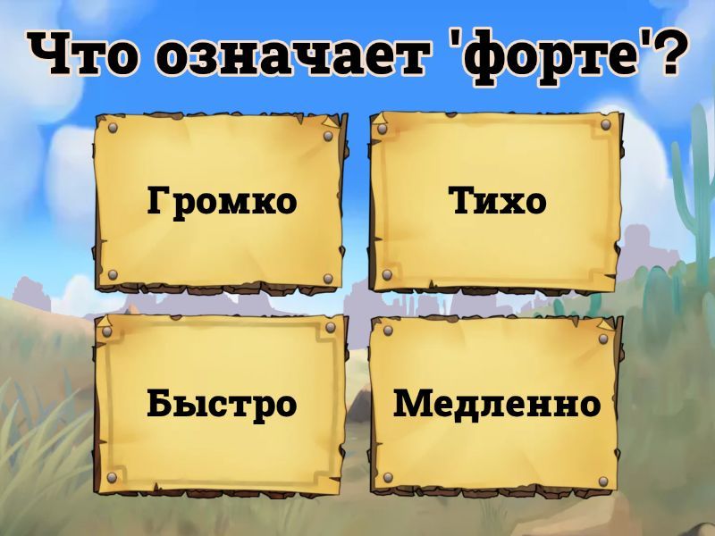 1) Что означает 'форте'? a) Громко b) Тихо c) Быстро d) Медленно 2) Что означает 'пиано'? a) Громко b) Быстро c) Тихо d) Медленно 3) Какой термин обозначает тихую игру? a) Форте b) Адажио c) Аллегро d) Пиано 4) Какой термин обозначает громкую игру? a) Пиано b) Форте c) Ларго d) Престо 5) Что значит a) Тихо b) Громко c) Дражаще d) Пискливо