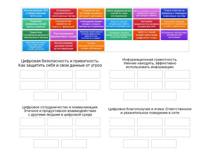Цифровая безопасность и приватность. Как защитить себя и свои данные от угроз : Использование двухфакторной аутентификации, Распознавание фишинговых писем, Регулярное обновление антивирусной программы, Настройка приватности в профиле социальной сети, Использование VPN в общественной Wi-Fi сети, Создание резервных копий важных файлов, Использование сложного, уникального пароля для каждого сервиса, Блокировка подозрительных электронных писем, Информационная грамотность. Умение находить, эффективно использовать информацию: Определение, является ли новость "фейковой", Поиск академических статей по теме исследования, Сравнение цен на товар на разных интернет-магазинах, Оценка авторитетности автора онлайн-публикации, Поиск ответов на вопросы с помощью поисковых систем, Цифровое сотрудничество и коммуникация. Этичное и продуктивное взаимодействие с другими людьми в цифровой среде: Написание вежливого и конструктивного комментария в онлайн-дискуссии, Соблюдение правил сетевого этикета (нетикета) в переписке, Грамотное составление делового электронного письма, Цифровое благополучие и этика. Ответственное и уважительное поведение в сети: Отказ от участия в травле кого-либо в интернете (кибербуллинг), Забота о своей онлайн-репутации (цифровом следе), Уважение чужого мнения в онлайн-дискуссиях, даже если оно отличается от вашего, Стремление к балансу между онлайн-активностью и реальной жизнью, Осознание влияния контента из социальных сетей на самооценку,