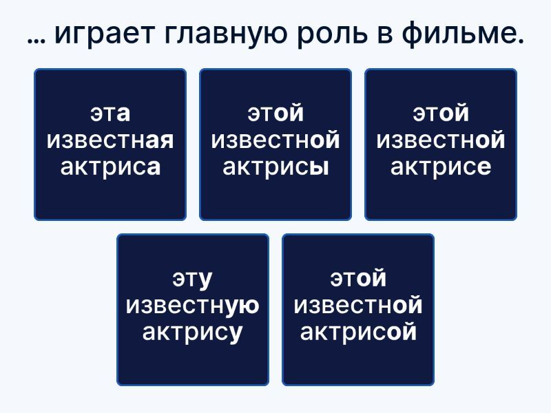 1) ... играет главную роль в фильме. a) эта известная актриса b) этой известной актрисы c) этой известной актрисе d) эту известную актрису e) этой известной актрисой 2) У ... большая коллекция премий. a) эта известная актриса b) этой известной актрисы c) этой известной актрисе d) эту известную актрису e) этой известной актрисой 3) У ... хороший вкус. a) эта известная актриса b) этой известной актрисы c) этой известной актрисе d) эту известную актрису e) этой известной актрисой 4) ... дарят цветы. a) эта известная актриса b) этой известной актрисы c) этой известной актрисе d) эту известную актрису e) этой известной актрисой 5) Я видел ... на красной дорожке. a) эта известная актриса b) этой известной актрисы c) этой известной актрисе d) эту известную актрису e) этой известной актрисой 6) Мы восхищаемся ... a) эта известная актриса b) этой известной актрисы c) этой известной актрисе d) эту известную актрису e) этой известной актрисой 7) Режиссёры часто работают с ... a) эта известная актриса b) этой известной актрисы c) этой известной актрисе d) эту известную актрису e) этой известной актрисой 8) Об ... сняли документальный фильм. a) эта известная актриса b) этой известной актрисы c) этой известной актрисе d) эту известную актрису e) этой известной актрисой 9) В статье рассказали о жизни ... a) эта известная актриса b) этой известной актрисы c) этой известной актрисе d) эту известную актрису e) этой известной актрисой 10) ... редко даёт интервью. a) эта известная актриса b) этой известной актрисы c) этой известной актрисе d) эту известную актрису e) этой известной актрисой 11) Журналисты задали ... несколько вопросов. a) эта известная актриса b) этой известной актрисы c) этой известной актрисе d) эту известную актрису e) этой известной актрисой 12) Телезрители обожают ... . a) эта известная актриса b) этой известной актрисы c) этой известной актрисе d) эту известную актрису e) этой известной актрисой 13) Пресса интересуется ... . a) эта известная актриса b) этой известной актрисы c) этой известной актрисе d) эту известную актрису e) этой известной актрисой 14) Благодаря ... фильм стал популярным. a) эта известная актриса b) этой известной актрисы c) этой известной актрисе d) эту известную актрису e) этой известной актрисой 15) В детстве ... мечтала стать балериной. a) эта известная актриса b) этой известной актрисы c) этой известной актрисе d) эту известную актрису e) этой известной актрисой