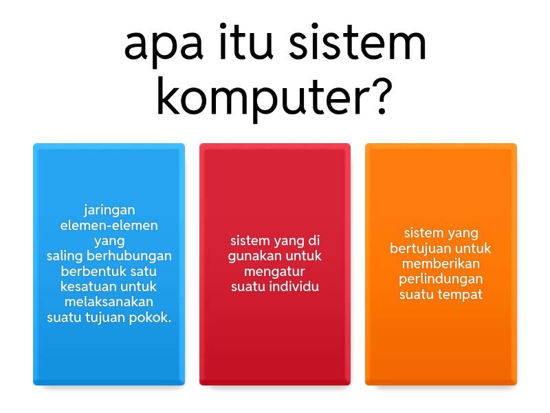 1) apa itu sistem komputer? a) jaringan elemen-elemen yang saling berhubungan berbentuk satu kesatuan untuk melaksanakan suatu tujuan pokok. b) sistem yang di gunakan untuk mengatur suatu individu c) sistem yang bertujuan untuk memberikan perlindungan suatu tempat 2) yang bukan termasuk komponen sistem komputer? a) Hardware b) Software c) Broinware d) Coreware 3) yang dimaksud Hardware? a) segala piranti/komponen dari sebuah komputer yang sifatnya bisa dilihat secara langsung/memiliki bentuk nyata b) Segala piranti dari sebuah komputer yang sifatnya tidak bisa dilihat secara langsung/memiliki bentuk tidak nyata 4) Hardware terbagi menjadi...bagian a) 2 b) 4 c) 8 d) tidak terbagi 5) yang termasuk bagian hardware? a) storage device b) proces derice c) imput derice d) output device 6) Apa itu Software? a) suatu bagian dari sistem komputer yang tidak memiliki wujud b) suatu bagian dari sistem komputer yang memiliki wujud 7) software terdiri dari....bagian a) 3 b) 2 c) 7 d) 5 8) Salah satu bagian dari software adalah operating system a) benar b) salah 9) yang dimaksud Brainware? a) komputer yang menjalankan sistem-sistemnya sendiri b) orang yang menggunakan/mengoperasikan sebuah perangkat komputer 10) Brainware terbagi menjadi 3 a) Salah b) benar