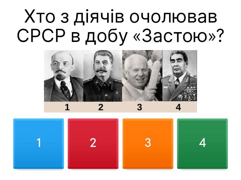 1) Хто з діячів очолював СРСР в добу «Застою»? a) 1 b) 2 c) 3 d) 4 2) Як в СРСР називали тих, хто виступав проти радянського тоталітарного режиму? a) Номенклатура b) Дисиденти c) Комсомольці d) Стахановці 3) Хто є автором книги? a) П Шелест b) Л Брежнєв c) О Гончар d) В Щербицький 4) Який факт про Українську Гельсінську спілку є помилковим? a) Створена у 1976 році b) Членами були В Стус, Л Лук´яненко, В Чорновіл …. c) Завдання - ознайомити громадян УРСР з порушеннями прав людини в світі d) Очолив М Руденко 5) З яким поняттям пов´язане зображення? a) Самвидав b) Раднаргосп c) Номенклатура d) Розвинений соціалізм 6) Якого діяча стосуються факти: навчався у Донецьку, працював вчителем української мови, 13 років провів за ґратами, помер в ув´язненні a) 1 b) 2 c) 3 d) 4 7) Яка нова галузь промисловості з´явилась в УРСР в період «застою»? a) Хімічна b) Нафтова c) Легка d) Атомна 8) Який процес не був характерним для УРСР в період «застою» a) Кількість міського населення збільшувалась b) Темпи приросту населення впали c) Кількість росіян зменшувалась d) В деяких областях була зафіксована депопуляція 9) Як Конституція УРСР 1978 р. визначала соціально-економічний лад, що існував у республіці? a) Комунізм b) Соціалізм c) Розвинений соціалізм d) Тоталітаризм 10) Яке явище радянської дійсності відображає карикатура? a) Хронічний дефіцит b) Житлова проблема c) Зростання безробіття d) Заборгованість по зарплаті 11) Яка споруда/пам´ятка прикрасила Київ в період «застою»? a) b) c) d)
