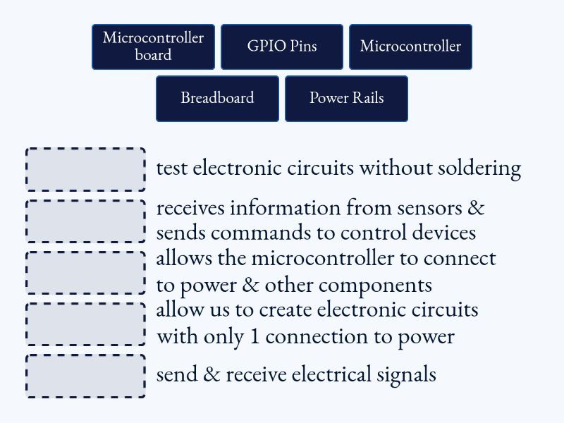 GPIO Pins - send & receive electrical signals, Power Rails - allow us to create electronic circuits with only 1 connection to power, Breadboard - test electronic circuits without soldering, Microcontroller - receives information from sensors & sends commands to control devices, Microcontroller board - allows the microcontroller to connect to power & other components,