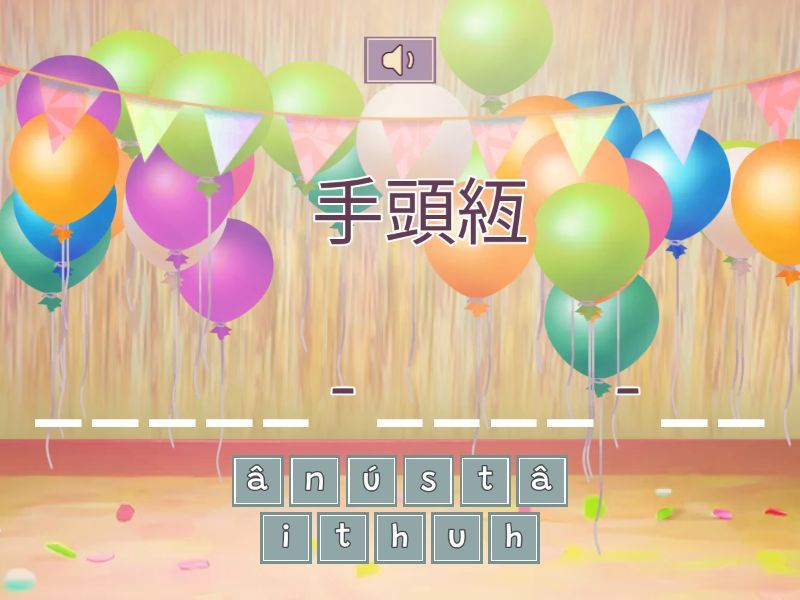a-bú - 阿母, a-kīm - 阿妗, a-ḿ - 阿姆, gín-á - 囡仔, ah-pà - 壓霸, a̍h-sái - 曷使, a̍h-sī - 抑是, ài-sńg - 愛耍, āinn-kin - 偝巾, ak-hue - 沃花, tsiunn-ám - 漿泔, ām-kún - 頷頸, án-ne - 按呢, án-tsuánn - 按怎, tshiú-thâu-ân - 手頭絚, ang-sài - 翁婿, ang-á - 尪仔, at-tn̄g - 遏斷, áu-sann - 漚衫, tê-au - 茶甌,