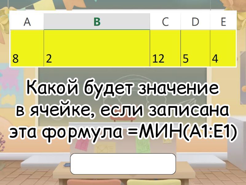 Какой будет значение в ячейке, если записана эта формула =МАКС(A1:E1)? , Какой будет значение в ячейке, если записана эта формула =МИН(A1:E1), Какой будет значение в ячейке, если записана эта формула =СРЗНАЧ(A1:E1)? , Какой будет значение в ячейке, если записана эта формула =СУММ(A1:E1)?.