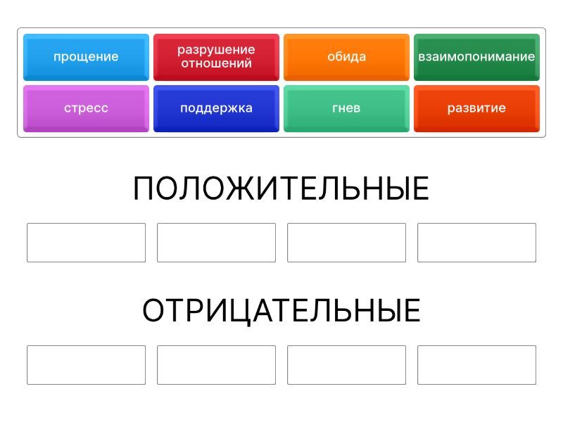 ПОЛОЖИТЕЛЬНЫЕ: взаимопонимание, развитие, поддержка, прощение, ОТРИЦАТЕЛЬНЫЕ: гнев, разрушение отношений, обида, стресс,