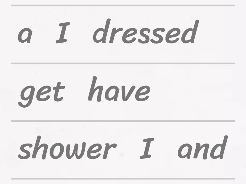 I have a shower and I get dressed, I have breakfast., I brush my teeth before I go to bed., I go to school., I have dinner., I get dressed., I put on my t-shirt., I wake up., I do my homework., I wash my hands before I have my dinner., I have lunch., I get undressed and I go to bed., I wake up at seven o'clock., I do my homework after dinner., I go swimming on Saturdays., I watch TV after dinner.,