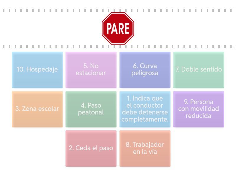 1. Indica que el conductor debe detenerse completamente., 2. Ceda el paso, 3. Zona escolar, 4. Paso peatonal, 5. No estacionar, 6. Curva peligrosa, 7. Doble sentido, 8. Trabajador en la vía, 9. Persona con movilidad reducida, 10. Hospedaje,