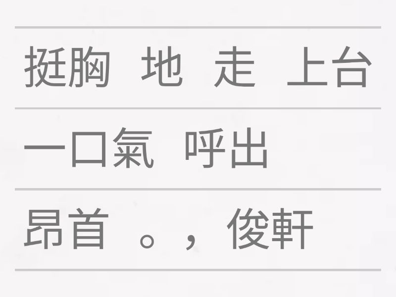 俊軒 呼出 一口氣 , 昂首 挺胸 地 走 上台 。, 要不要 警方 徹底地 偵查 , 賊人 也 不會 那麼快 落網 。, 我 應該 犧牲 一點 睡眠的 時間 , 還是 把 功課 留待 明天 完成 。, 長者 不但 希望 可以 與 家人 聚會 , 而且 希望 得到 家人 的 關懷 。,