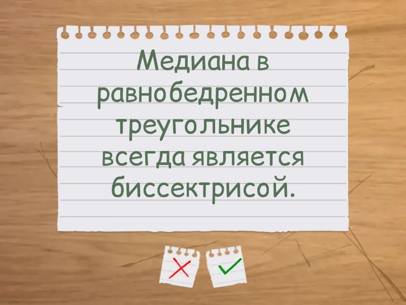 В равнобедренном треугольнике углы при вершине равны. - нет, Если в треугольнике два угла равны, то он равнобедренный - да, Любой равносторонний треугольник — равнобедренный - да, Любой равнобедренный треугольник — равносторонний. - нет, Медиана в равнобедренном треугольнике всегда является биссектрисой. - нет, Биссектриса делит угол пополам - да,