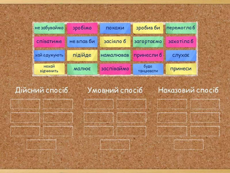 Дійсний спосіб: загортаємо, слухає, малює, намалював, підійде, буде танцювати, співатиме, Умовний спосіб: зробив би, захотіла б, перемогла б, не впав би, принесли б, засіяло б, Наказовий спосіб: принеси, зробімо, заспіваймо, нехай відчинить, покажи, не забуваймо, хай одужують,