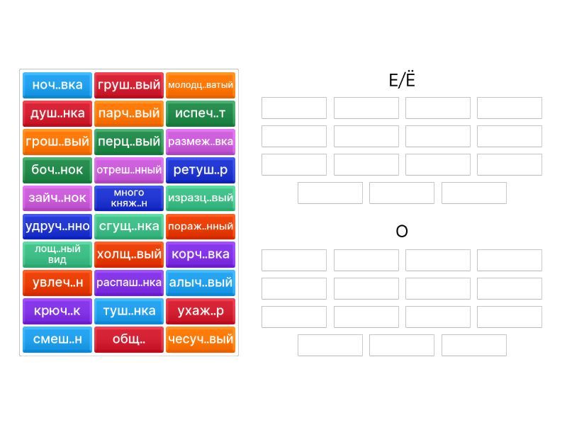 Е/Ё: туш..нка, корч..вка, увлеч..н, ухаж..р, груш..вый, ноч..вка, размеж..вка, молодц..ватый, ретуш..р, пораж..нный, удруч..нно, сгущ..нка, лощ..ный вид, испеч..т, отреш..нный, О: смеш..н, чесуч..вый, грош..вый, зайч..нок, крюч..к, алыч..вый, много княж..н, общ.., распаш..нка, боч..нок, изразц..вый, душ..нка, холщ..вый, перц..вый, парч..вый,