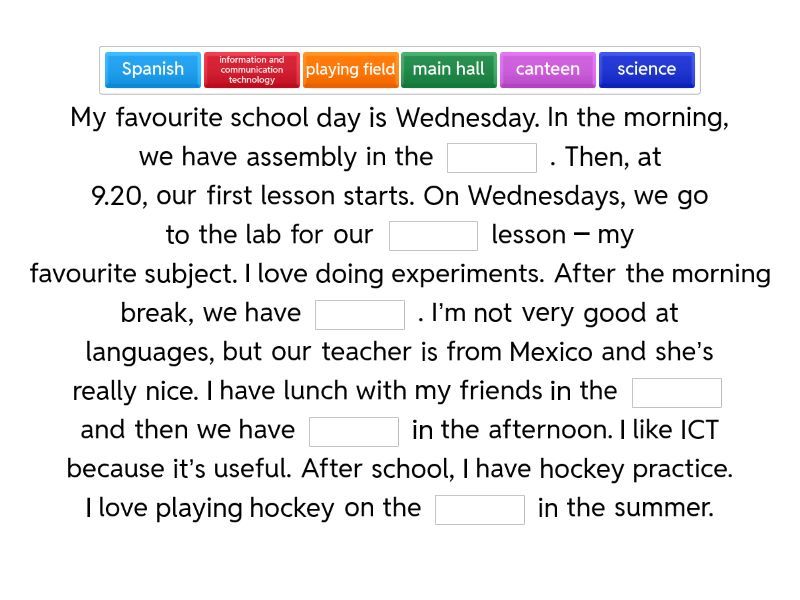 My favourite school day is Wednesday. In the morning, we have assembly in the ____ . Then, at 9.20, our first lesson starts. On Wednesdays, we go to the lab for our ____ lesson – my favourite subject. I love doing experiments. After the morning break, we have ____ . I’m not very good at languages, but our teacher is from Mexico and she’s really nice. I have lunch with my friends in the ____ and then we have ____ in the afternoon. I like ICT because it’s useful. After school, I have hockey practice. I love playing hockey on the ____ in the summer. 1 Can you make pizza? B Yes, I can. I love cooking. ____ is my favourite subject. 2 A What’s the capital of Australia? B I don’t know. I’m not very good at ____! 3 A ¡Hola! ¿Cómo estás? B Sorry. I don’t study ____ . Please can you say that in English? 4 A Do you like my picture? B Wow! It’s amazing! You’re really good at ____ ! 5 A I need a book about Ancient Rome for my ____ homework. B OK. Let’s go to the ____ after school. 6 A Where’s our ____ lesson? B It’s in the ____ today We have 40 modern classrooms, including three science ____ and a big ____ with 30 computers. There’s also an excellent ____ with more than 10,000 books and magazines. Students can study three different languages at Oakdale and play five different sports. We have a big playing ____ and a new 5 ____ for PE lessons. Lots of our students sing, play instruments or act. After school, students can go to 6 ____ and drama clubs, and we often have concerts and plays in the main hall.