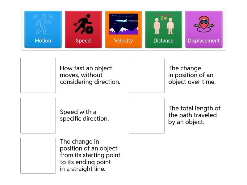 Motion - The change in position of an object over time., Displacement - The change in position of an object from its starting point to its ending point in a straight line., Distance - The total length of the path traveled by an object., Speed - How fast an object moves, without considering direction., Velocity - Speed with a specific direction.,
