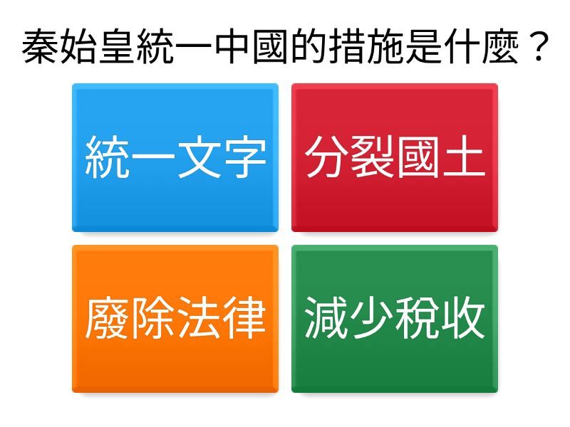 1) 秦始皇統一中國的措施是什麼? a) 統一文字 b) 分裂國土 c) 廢除法律 d) 減少稅收 2) 秦始皇統一度量衡的目的是什麼? a) 促進貿易 b) 增加稅收 c) 削弱貴族 d) 擴大疆域 3) 秦朝的中央集權制度是如何實施的? a) 郡縣制 b) 封建制 c) 宗法制 d) 聯邦制 4) 秦朝修建長城的主要目的? a) 防禦匈奴 b) 擴大疆域 c) 促進貿易 d) 增加稅收 5) 秦朝的法律制度有何特點? a) 嚴刑峻法 b) 寬鬆自由 c) 無法可依 d) 以德治國 6) 秦朝的統一對中國歷史的影響是什麼? a) 奠定基礎 b) 導致分裂 c) 無影響 d) 加重負擔 7) 秦朝滅亡的主要原因是什麼? a) 暴政 b) 外敵入侵 c) 經濟繁榮 d) 文化衰退 8) 秦始皇焚書坑儒的目的是什麼? a) 控制思想 b) 增加知識 c) 促進文化 d) 減少開支 9) 秦朝的經濟政策有何特點? a) 重農抑商 b) 自由貿易 c) 鼓勵工業 d) 減少稅收 10) 秦朝的軍事力量如何? a) 強大 b) 薄弱 c) 中等 d) 無軍隊 11) 秦始皇的陵墓位於哪裡? a) 陝西 b) 北京 c) 上海 d) 廣州 12) 秦朝的文化政策是什麼? a) 焚書坑儒 b) 百家爭鳴 c) 尊儒重道 d) 文藝復興 13) 秦朝的行政區劃是什麼? a) 郡縣制 b) 州郡制 c) 封建制 d) 聯邦制 14) 秦朝的稅收政策如何? a) 重稅 b) 免稅 c) 低稅 d) 無稅 15) 秦朝的外交政策是什麼? a) 閉關鎖國 b) 開放貿易 c) 聯合外國 d) 擴張領土 16) 秦朝的社會結構如何? a) 中央集權 b) 分封制 c) 民主制 d) 聯邦制 17) 秦朝的宗教政策是什麼? a) 無宗教 b) 佛教 c) 道教 d) 儒教 18) 秦朝的科技成就有哪些? a) 兵馬俑 b) 指南針 c) 造紙術 d) 火藥 19) 秦朝的文化遺產是什麼? a) 長城 b) 紫禁城 c) 故宮 d) 兵馬俑 20) 秦朝的滅亡對後世的啟示是什麼? a) 暴政不可行 b) 擴張有利 c) 文化衰退 d) 經濟繁榮 21) 秦始皇修建阿房宮的目的? a) 促進貿易 b) 擴大疆域 c) 彰顯權威 d) 減少稅收 22) 秦始皇為什麼修建直道? a) 擴大疆域 b) 加強交通 c) 促進貿易 d) 削弱貴族 23) 秦始皇統一貨幣的目的? a) 削弱貴族 b) 促進經濟 c) 擴大疆域 d) 減少稅收 24) 秦始皇修建直道的主要用途是什麼? a) 文化交流 b) 軍事運輸 c) 農業發展 d) 外交活動 25) 秦始皇為什麼修建靈渠? a) 促進貿易 b) 改善灌溉 c) 擴大疆域 d) 削弱貴族 26) 秦始皇修建長城的次要目的? a) 防禦匈奴 b) 彰顯權威 c) 促進貿易 d) 擴大疆域 27) 秦始皇為什麼推行郡縣制? a) 削弱貴族 b) 促進貿易 c) 加強中央集權 d) 擴大疆域