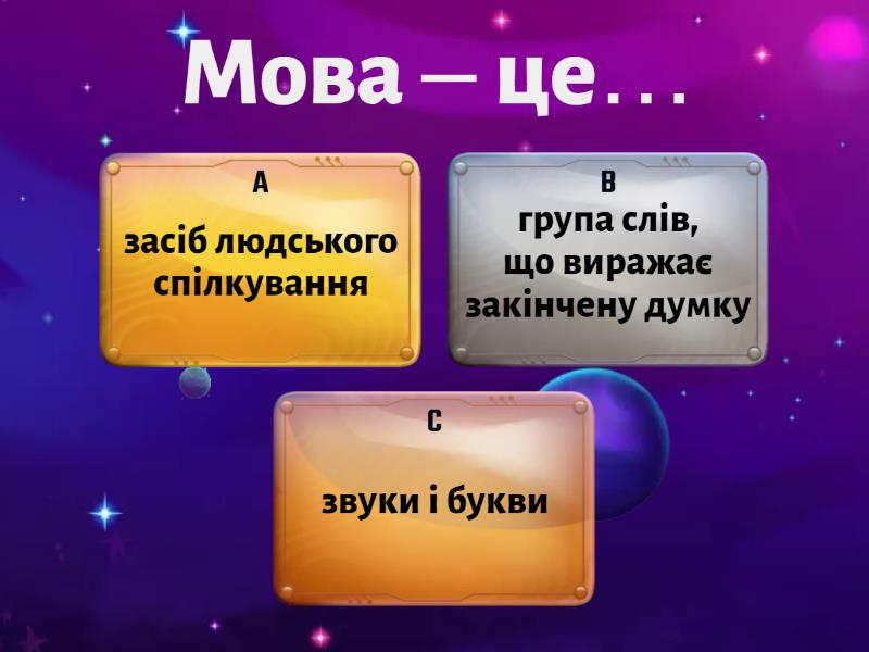 1) Мова – це… a) засіб людського спілкування b) група слів, що виражає закінчену думку c) звуки і букви 2) Мовлення – це… a) точні, правильно вжиті слова b) передача своєї думки c) діяльність людини, застосування мови для спілкування, для передачі своїх думок, почуттів 3) Слово – звертання на письмі виділяється a) знаком питання b) комою c) комою або знаком оклику 4) Звертанням у реченні Вийди, вийди, сонечко, на дідове полечко... є a) вийди b) сонечко c) полечко 5) Мовлення буває... a) усне і писемне b) усне і знакове c) писемне і навчальне 6) Мовлення складається: a) із речень, розмови b) із слів, голосу і жестів c) із спілкування, письма, читання 7) Якими словами ми вітаємося? a) будь ласка, дякую b) доброго дня, добрий вечір c) бувай, до зустрічі 8) Культура мовлення — це: a) звуки, букви, алфавіти b) словосполучення, речення, текст c) правильність, чіткість, точність, виразність мовленнєвого слова 9) За допомогою мовлення людина: a) спілкується з іншими людьми, висловлює свої думки в усній чи писемній формі b) досягає успіху c) думає, мріє, розмірковує 10) Познач рядок, в якому слова вжитиі у формі звертання a) мамо, бабуся, земле b) сестро, школо, весно c) Україно, тату, школа