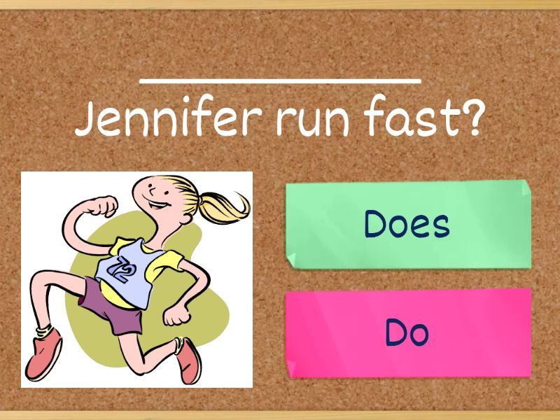 1) __________ Jennifer run fast?  a) Does b) Do 2) __________ we go to school at 8.00 o'clock? a) Does b) Do 3) ___________ they play football? a) Does b) Do 4) __________ Ann and Tom go to bed early? a) Does b) Do 5) __________ you go to dance classes? a) Do b) Does 6) __________ Mary and Sam play video games?  a) Do b) Does 7) __________ she collect badges?  a) Does b) Do 8) ___________ he play volleyball? a) Do b) Does 9) ___________ John and Mike play football? a) Do b) Does 10) ___________ Sarah play the violin? a) Do b) Does