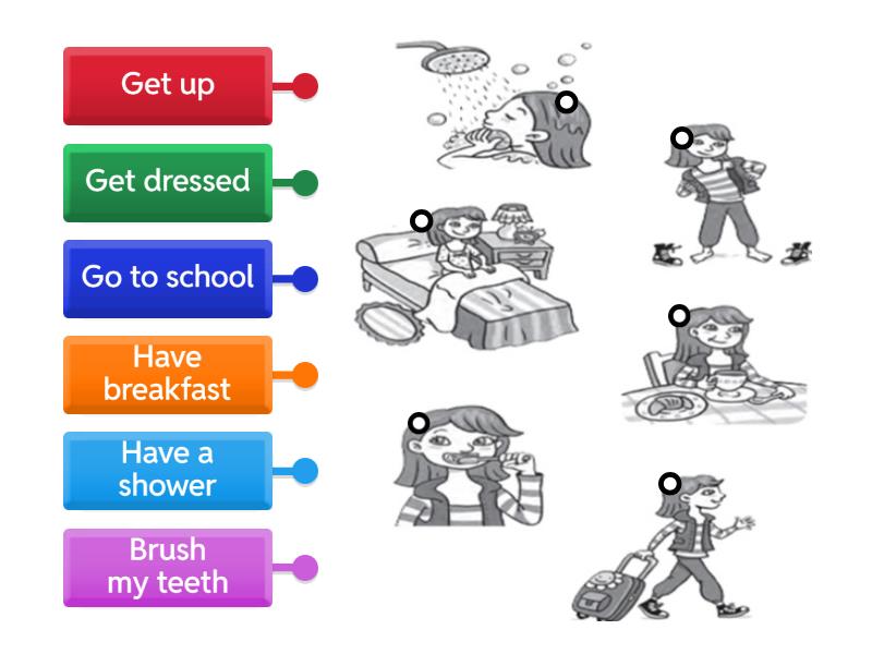 Have a shower, Get up, Have breakfast, Get dressed, Brush my teeth, Go to school.