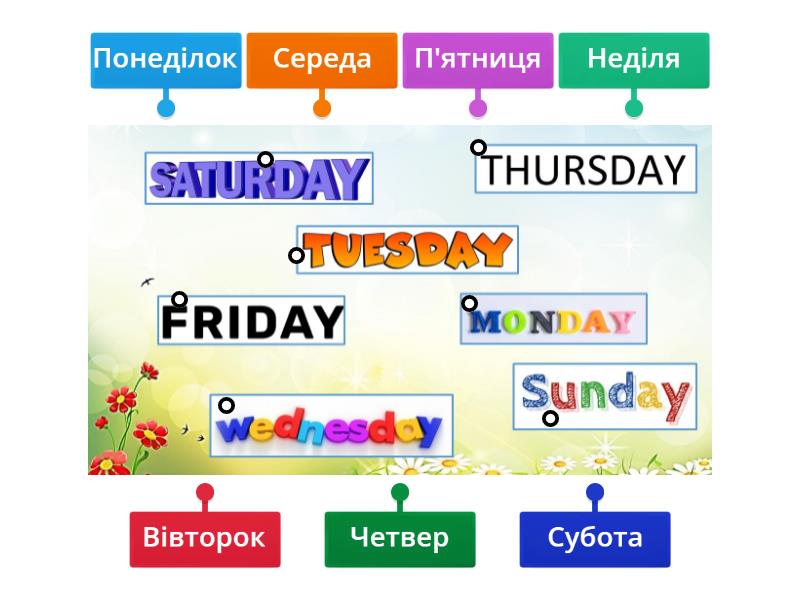Понеділок, Вівторок, Середа, Четвер, П'ятниця, Субота, Неділя.