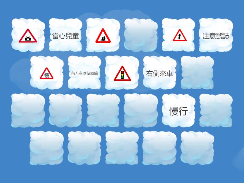 當心兒童, 注意號誌, 慢行, 前方有測試取締, 右側來車, 連續彎路先向左彎, 禁止四輪以上, 禁止大貨車及聯結車進入, 行人專用, 當心自行車, 汽車專行,