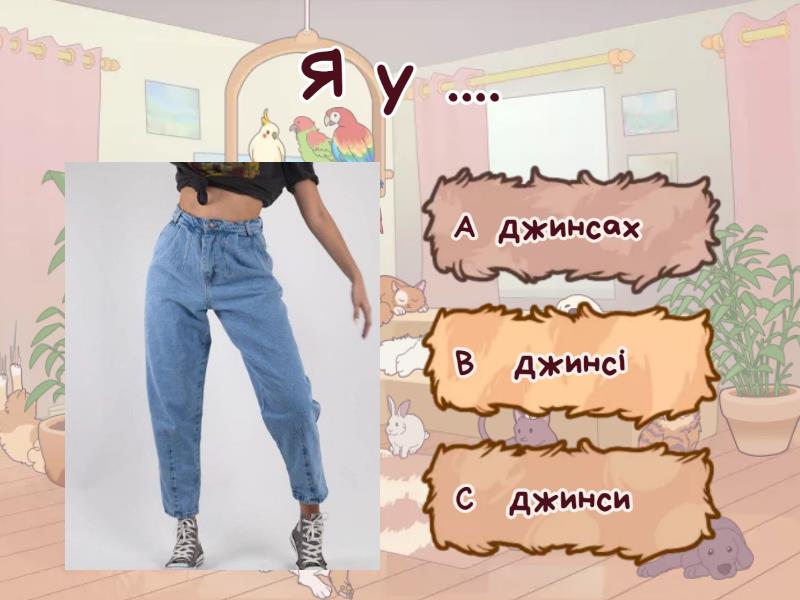 1) Я у .... a) джинсах b) джинсі c) джинси 2) Я у ... a) спідниця b) спідниці c) спідницю 3) Я у ... a) штани b) штанах c) штанох 4) Я у ... a) футболці b) футболка c) футболкі 5) Я у ... a) сукнях b) сукня c) сукні 6) Я у ... a) шкарпетках b) шкарпетки c) шкарпетку 7) Я у ... a) шорти b) шорт c) шортах 8) Я у ... a) туфлі b) туфлях c) туфлюх 9) Я у ... a) кросівку b) кросівках c) кросівки 10) Я у ... a) сорочка b) сорочкі c) сорочці
