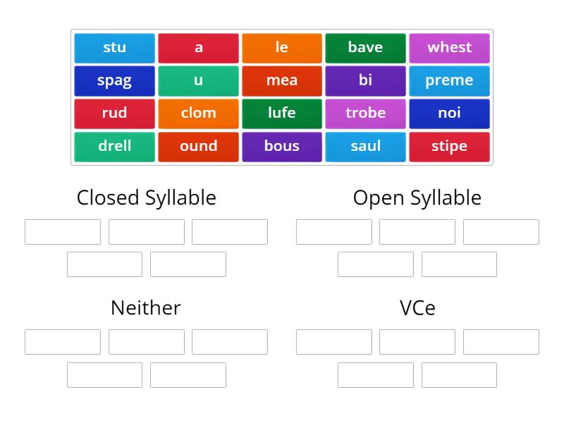 Closed Syllable: whest, clom, drell, rud, spag, Open Syllable: a, bi, le, u, stu, Neither: mea, noi, bous, saul, ound, VCe: stipe, bave, trobe, preme, lufe,