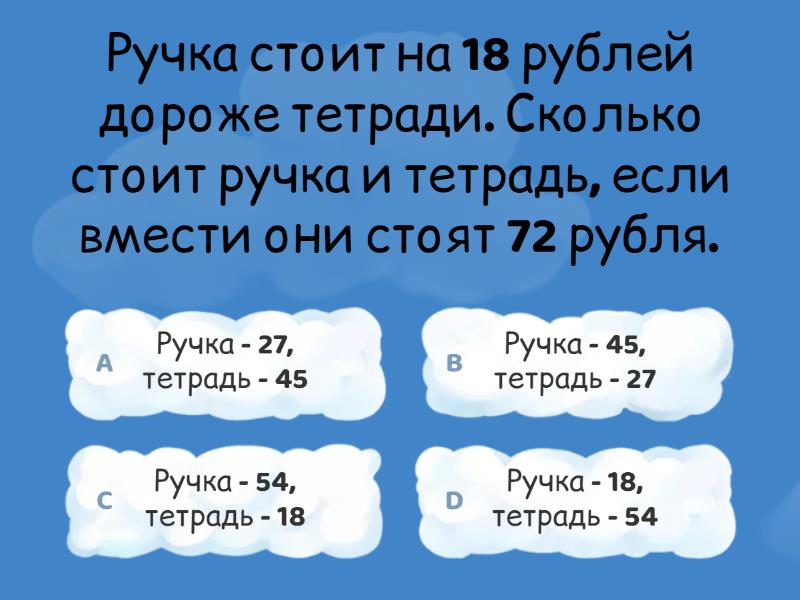 1) Ручка стоит на 18 рублей дороже тетради. Сколько стоит ручка и тетрадь, если вмести они стоят 72 рубля. a) Ручка - 27, тетрадь - 45 b) Ручка - 45, тетрадь - 27 c) Ручка - 54, тетрадь - 18 d) Ручка - 18, тетрадь - 54 2) Три школы получили 70 компьютеров. Вторая школа получила на 6 компьютеров больше первой, а третья — на 10 компьютеров больше второй. Сколько компьютеров получила вторая школа? a) 16 компьютеров b) 32 компьютера c) 22 компьютера d) 23 компьютера 3) Трое рабочих изготовили вместе 777 деталей, причем второй изготовил в 3 раза больше деталей, чем третий, а первый на 117 больше, чем третий. Сколько деталей изготовил первый рабочий? a) 249 деталей b) 132 детали c) 396 деталей d) 279 деталей