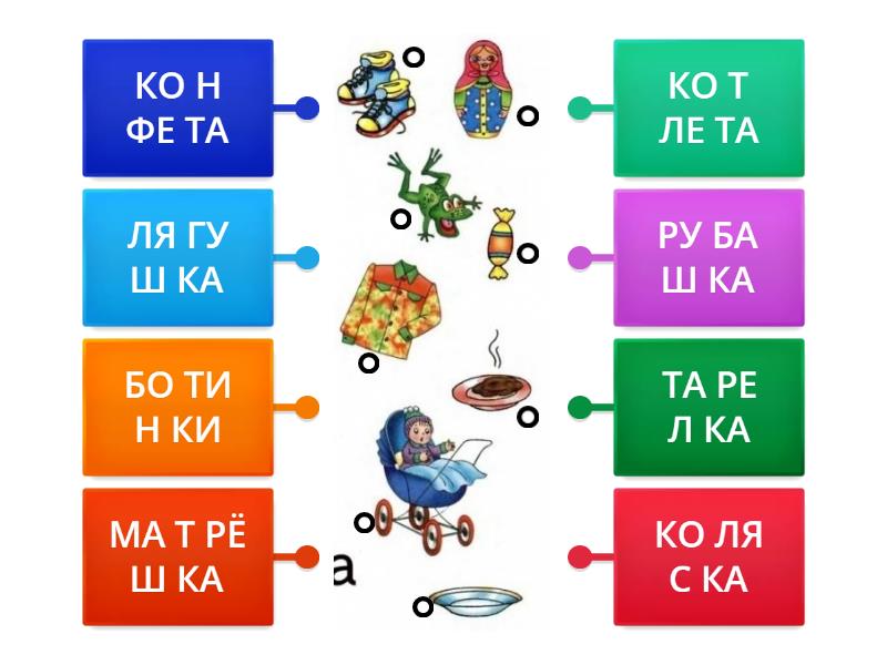 ЛЯ ГУ Ш КА, КО ЛЯ С КА, БО ТИ Н КИ, ТА РЕ Л КА, РУ БА Ш КА, КО Н ФЕ ТА, КО Т ЛЕ ТА, МА Т РЁ Ш КА.
