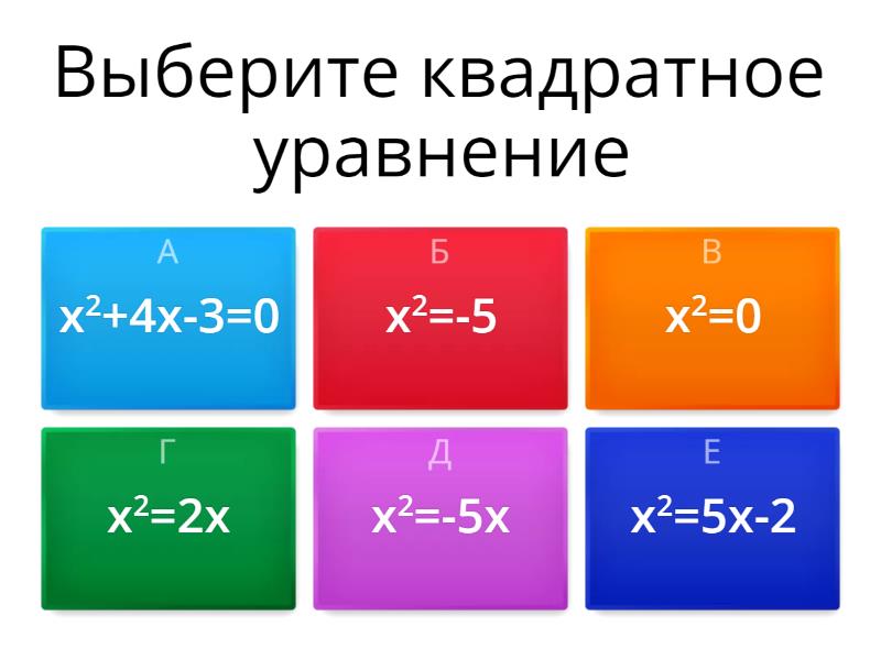1) Выберите квадратное уравнение a) x2+4x-3=0 b) x2=-5 c) x2=0 d) x2=2x e) x2=-5x f) x2=5x-2