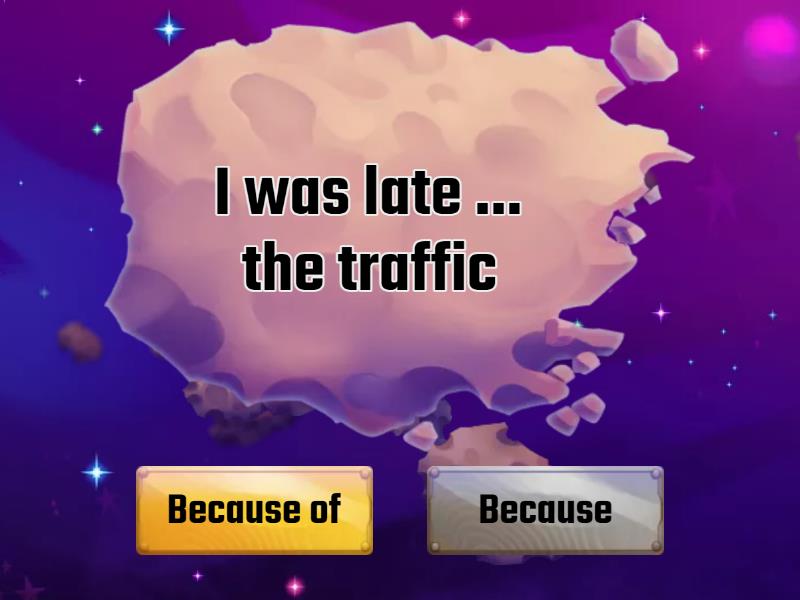 Because of: I was late ... the traffic , I could not sleep ... the noise, The school is closed ... COVID-19, We were bored ... the speech, Your voice is good ... the mic, Because: I called a taxi ... it was raining,  They didn't swim ... it was cold, I came here ... he invited me, Anna wants to be a singer ... she likes singing  , Manda didn't go to school ... she is sick,