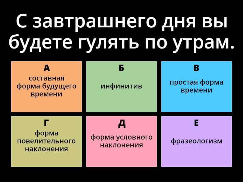 1) С завтрашнего дня вы будете гулять по утрам. a) составная форма будущего времени b) инфинитив c) простая форма времени d) форма повелительного наклонения e) форма условного наклонения f) фразеологизм 2) Пусть каждый узнает об этой новости. a) составная форма будущего времени b) инфинитив c) простая форма времени d) форма повелительного наклонения e) форма условного наклонения f) фразеологизм 3) Люди пахать, а мы руками махать. a) составная форма будущего времени b) инфинитив c) простая форма времени d) форма повелительного наклонения e) форма условного наклонения f) фразеологизм 4) Эта мысль привела её в ужас. a) составная форма будущего времени b) инфинитив c) простая форма времени d) форма повелительного наклонения e) форма условного наклонения f) фразеологизм 5) Он выходит из себя по любому поводу. a) составная форма будущего времени b) инфинитив c) простая форма времени d) форма повелительного наклонения e) форма условного наклонения f) фразеологизм 6) Всё утро я ловлю рыбу. a) составная форма будущего времени b) инфинитив c) простая форма времени d) форма повелительного наклонения e) форма условного наклонения f) фразеологизм 7) А ты и плакать сейчас же. a) составная форма будущего времени b) инфинитив c) простая форма времени d) форма повелительного наклонения e) форма условного наклонения f) фразеологизм 8) Пускай он оставит письмо в почтовом ящике. a) составная форма будущего времени b) инфинитив c) простая форма времени d) форма повелительного наклонения e) форма условного наклонения f) фразеологизм 9) Я бы никогда его не простил. a) составная форма будущего времени b) инфинитив c) простая форма времени d) форма повелительного наклонения e) форма условного наклонения f) фразеологизм 10) Ребята успешно начали новый учебный год. a) составная форма будущего времени b) инфинитив c) простая форма времени d) форма повелительного наклонения e) форма условного наклонения f) фразеологизм 11) А ты не обижайся, Емеля. a) составная форма будущего времени b) инфинитив c) простая форма времени d) форма повелительного наклонения e) форма условного наклонения f) фразеологизм 12) Мне бросилось в глаза старое тряпьё в углу прихожей. a) составная форма будущего времени b) инфинитив c) простая форма времени d) форма повелительного наклонения e) форма условного наклонения f) фразеологизм 13) Вдруг вперёд нас бросилось испуганное звуками стадо. a) составная форма будущего времени b) инфинитив c) простая форма времени d) форма повелительного наклонения e) форма условного наклонения f) фразеологизм 14) Давайте повторим все правила. a) составная форма будущего времени b) инфинитив c) простая форма времени d) форма повелительного наклонения e) форма условного наклонения f) фразеологизм 15) Будем биться вдвоем, до потери сознания, о крутые пороги восторгов и мук. a) составная форма будущего времени b) инфинитив c) простая форма времени d) форма повелительного наклонения e) форма условного наклонения f) фразеологизм