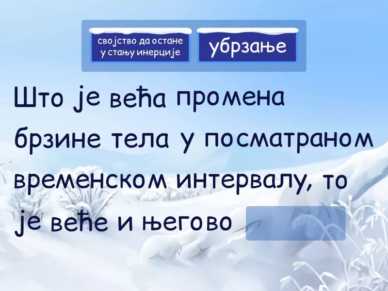 Што је већа промена брзине тела у посматраном временском интервалу, то је веће и његово ____ Ако се два тела различитих маса крећу једнаким ____ , то значи да на тело мање масе делује слабија ____ него на тело веће масе. Свака сила ____ доводи до ____ силе ____ истог ____ , супротних ____ , али једнаких ____