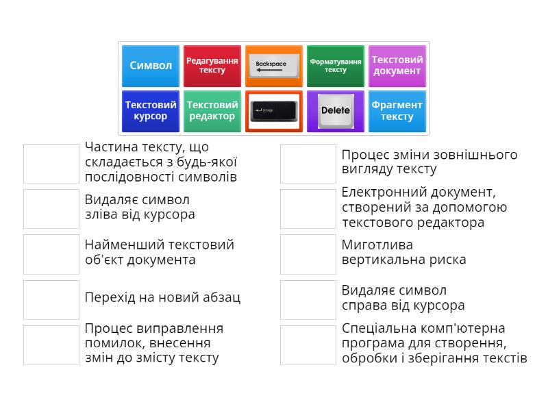 Текстовий редактор - Спеціальна комп'ютерна програма для створення, обробки і зберігання текстів , Текстовий документ - Електронний документ, створений за допомогою текстового редактора , Текстовий курсор - Миготлива вертикальна риска  , Редагування тексту - Процес виправлення помилок, внесення змін до змісту тексту , Видаляє символ зліва від курсора  , Видаляє символ справа від курсора , Перехід на новий абзац , Фрагмент тексту - Частина тексту, що складається з будь-якої послідовності символів , Форматування тексту - Процес зміни зовнішнього вигляду тексту  , Символ - Найменший текстовий об'єкт документа ,