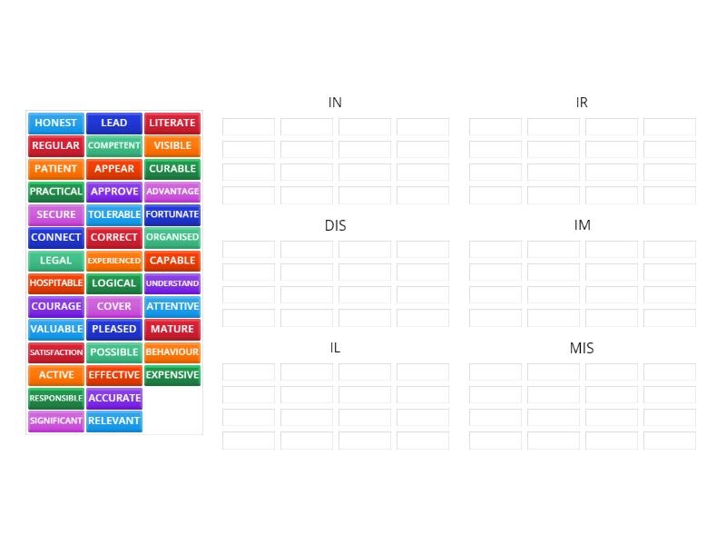 IN: ACCURATE, ACTIVE, ATTENTIVE, CAPABLE, COMPETENT, CORRECT, CURABLE, EFFECTIVE, EXPENSIVE, EXPERIENCED, HOSPITABLE, SECURE, SIGNIFICANT, TOLERABLE, VALUABLE, VISIBLE, IR: REGULAR, RELEVANT, RESPONSIBLE, DIS: ADVANTAGE, APPEAR, APPROVE, CONNECT, COURAGE, COVER, HONEST, ORGANISED, PLEASED, SATISFACTION, IM: MATURE, PATIENT, POSSIBLE, PRACTICAL, IL: LEGAL, LITERATE, LOGICAL, MIS: BEHAVIOUR, FORTUNATE, LEAD, UNDERSTAND,