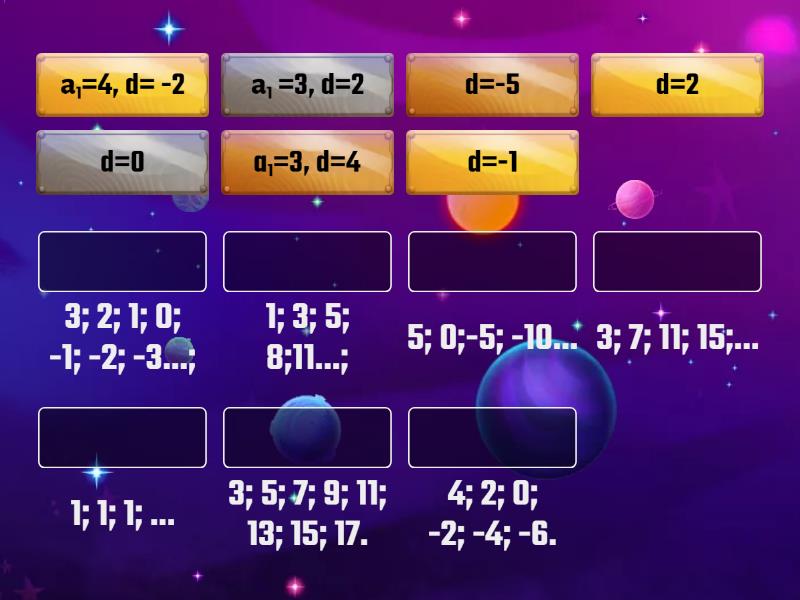 d=2 - 1; 3; 5; 8;11...;, d=-1 - 3; 2; 1; 0; -1; -2; -3...;, а1 =3, d=2  - 3; 5; 7; 9; 11; 13; 15; 17., а1=4, d= -2   - 4; 2; 0; -2; -4; -6., d=-5 - 5; 0;-5; -10..., d=0 - 1; 1; 1; ..., a1=3, d=4 - 3; 7; 11; 15;...,
