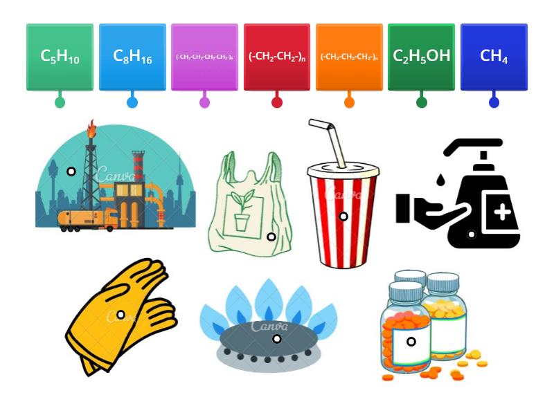 C8H16, (-CH2-CH2-)n, (-CH2-CH2-CH2-)n, C2H5OH, (-CH2-CH2-CH2-CH2-)n, CH4, C5H10.