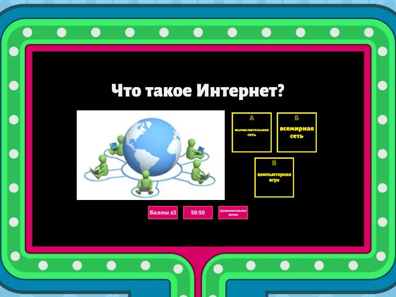 1) Что такое Интернет? a) вычислительная сеть b) всемирная сеть c) компьютерная игра 2) Нужно ли в интернете всем сообщать свою фамилию, имя, адрес, номер школы? a) всем виртуальным друзьям нужно рассказать о себе b) никогда не сообщать личную информацию c) сообщать только вымышленную информацию 3) Можно ли отправлять SMS или оставлять свой номер телефона с незнакомого сайта, чтобы получить код доступа к игре или подарку? a) никогда не следует отправлять SMS или давать свой номер телефона b) всегда оставлять номер телефона, а SMS слать нельзя c) всегда отправлять сообщение и давать номер, чтобы получить код доступа 4) Что такое ник? a) вымышленное виртуальное имя b) компьютерная программа c) компьютерный герой 5) Виртуальный друг предлагает встретиться, ваши действия: a) встретиться с виртуальным другом в торговом центре b) сообщить родителям о встрече c) встретиться с виртуальным другом в заброшенном, таинственном месте 6) На вашу электронную почту пришло письмо от неизвестного адресата, вы: a) сохраните в черновики и откроете позднее b) откроете немедленно c) никогда не открываете писем от неизвестных адресатов 7) В сети вы встретились с дразнилками и оскорблениями, вы: a) отвечаете грубостью b) заблокируете этого человека и сообщите родителям c) никому об этом не говорите 8) Компьютерным вирусом называется ... a) заболевание  b) компьютерная программа, нарушающая работу других программ c) компьютерный герой-шпион 9) Антивирусная программа - ... a) программа обнаружения вирусов на вашем компьютере b) название журнала о компьютерах c) программа закаливания организма 10) Сколько времени детям, по мнению специалистов, можно проводить детям за компьютером? a) пока не выиграешь в любимую игрушку b) пока не подготовишься к урокам c) не более часа в день