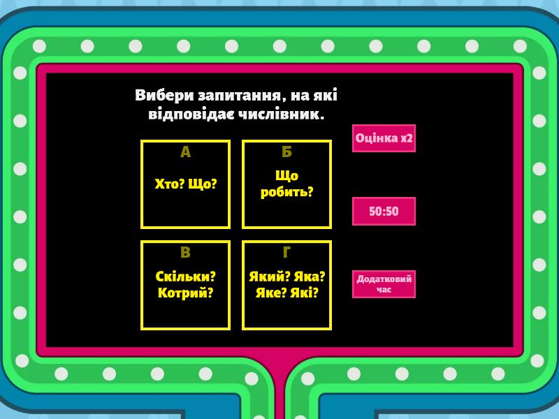 1) Вибери запитання, на які відповідає числівник. a) Хто? Що? b) Що робить? c) Скільки? Котрий? d) Який? Яка? Яке? Які? 2) Підбери числівник у речення: "Мама купила ... пиріжки". a) четверо b) четвертий c) чотьрьох d) чотири 3) Як правильно записати числівник "16" словами? a) Шіснадцять b) Шістнадцять c) Шістьнадцять d) Шістнацять 4) Як правильно записати числівник "53" словами? a) П'ятдисят три b) Пядесят три c) П'ятдесят три d) П'ядесят три 5) Який числівник вставимо у речення: "Бабуся купила ... яблук." ? a) Восьме b) Вісім c) Восьмеро d) Вісьми 6) Як правильно? a) До трьох плюс чотири дорівнює сім. b) До трьох додати чотири буде шість. c) Три додати чотири буде сім. d) Три плюс чотири дорівнює сім. 7) З якою частиною мови пов'язаний іменник? a) Прикметник b) Іменник c) Дієслово