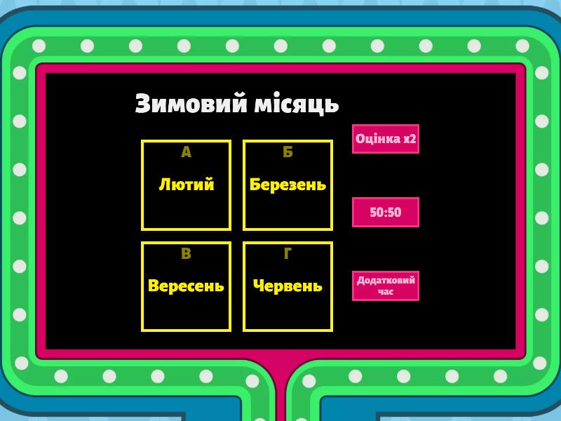 1) Зимовий місяць a) Лютий b) Березень c) Вересень d) Червень 2) Зимові явища природи a) Роса b) Цвітіння дерев c) Мороз d) Веселка 3) Птах, який зимує у наших краях a) Ластівка b) Лелека c) Синичка d) Чайка 4) Для чого взимку потрібен сніг? a) Для розваг b) Тільки для краси c) Завдяки снігу стає холодніше d) Сніг вкриває дерева і кущі, захищає їх від морозів 5) Кожна пора року триває a) 6 місяців b) 3 місяці c) 12 місяців d) 2 місяці 6) Про який місяць кажуть "Рік кінчає, а зиму починає"? a) січень b) лютий c) грудень d) березень