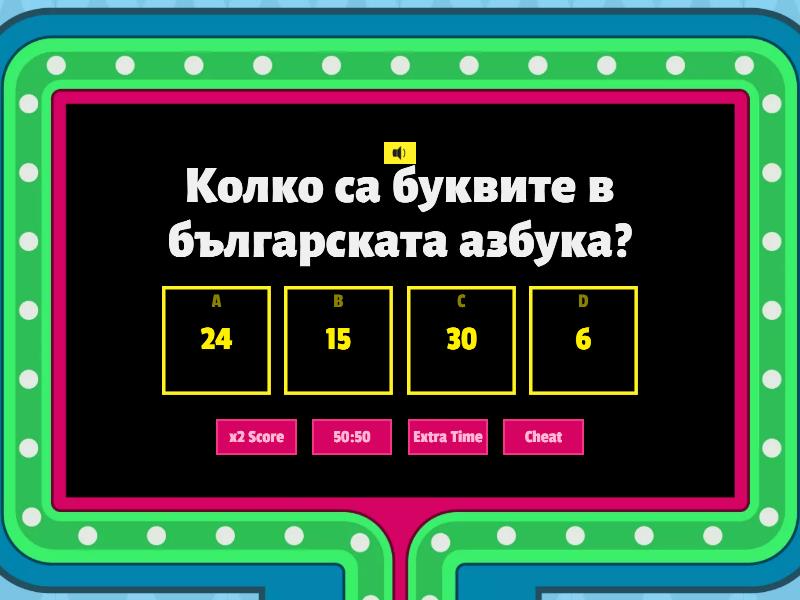 1) Колко са буквите в българската азбука? a) 15 b) 24 c) 30 d) 6 2) Колко са гласните звукове в българския език? a) 5 b) 8 c) 10 d) 6 3) Какво образуват думите, свързани по смисъла? a) срички b) текст c) изречения 4) Какво образуват изреченията, свързани по смисъла? a) мелодия b) текст 5) Колко са сричките в думата "лимон"? a) 1 b) 2 c) 3 6) Колко са сричките в думата "тетрадка"? a) 4 b) 2 c) 3 7) От колко срички са съставени думите "мост" и "шоколад"? a) 2, 3 b) 1, 3 c) 1, 4 8) "йо" или "ьо"? a) Петйо b) Петъо 9) "йо" или "ьо"? a) йод b) ьод 10) "йо" или "ьо"? a) раьон b) район 11) С коя буква завършва думата "ори..."? a) с b) з 12) С коя буква завършва думата "пло..."? a) т b) д 13) С коя дума можем да проверим как се пише "молив"? a) моливче b) моливи 14) Правилно ли е написана думата "къща"? a) Да b) Не 15) Можем ли да пренесем на нов ред думата "орех"? a) Да b) Не 16) Можем ли да пренесем на нов ред думата "бряг"? a) Да b) Не 17) С или със ще напишем пред думата "захар"? a) с b) със