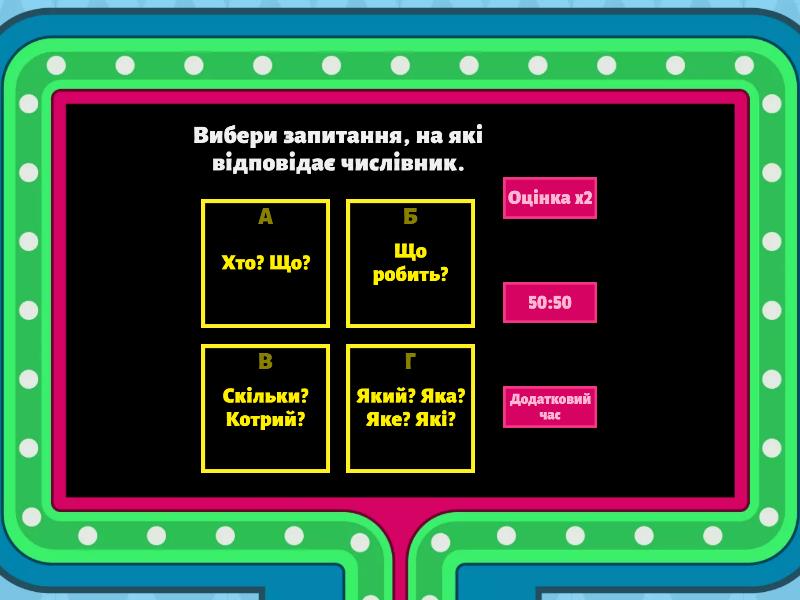 1) Вибери запитання, на які відповідає числівник. a) Хто? Що? b) Що робить? c) Скільки? Котрий? d) Який? Яка? Яке? Які? 2) Підбери числівник у речення: "Мама купила ... пиріжки". a) четверо b) четвертий c) чотьрьох d) чотири 3) Як правильно записати числівник "16" словами? a) Шіснадцять b) Шістнадцять c) Шістьнадцять d) Шістнацять 4) Вибери серед поданих простий числівник. a) Дев'ять b) Сімнадцять c) Двадцять два d) Дев'яносто 5) Вибери серед поданих складений числівник. a) Вісім b) Одинадцять c) Сорок d) Сорок два 6) Як правильно записати числівник "53" словами? a) П'ятдисят три b) Пядесят три c) П'ятдесят три d) П'ядесят три 7) Який числівник вставимо у речення: "Бабуся купила ... яблук." ? a) Восьме b) Вісім c) Восьмеро d) Вісьми 8) Встав числівник у речення: "О ... годині ранку я снідаю" a) восьмі b) восьмій c) вісім d) восьма 9) Який числівник простий? a) Чотири b) Дванадцять c) Чотириста d) Сто два 10) Яке словосполучення вжите правильно? a) Сім хліба b) Три апельсини c) Сто книга d) Двадцять метри