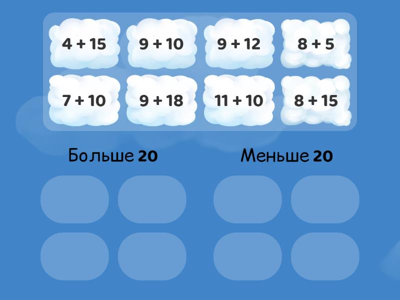 Больше 20: 11 + 10, 9 + 12, 8 + 15, 9 + 18, Меньше 20: 9 + 10, 8 + 5, 7 + 10, 4 + 15,