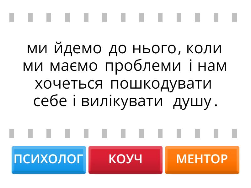 ПСИХОЛОГ - ми йдемо до нього, коли ми маємо проблеми і нам хочеться пошкодувати себе і вилікувати душу., КОУЧ - ставить питання, щоб виявити власний потенціал людиниклієнта називають пацієнтом, МЕНТОР - працюють з минулим та сьогоденнястежить за тим, щоб клієнт правильно виконував завдання, доки не буде досягнуто потрібного результатум,