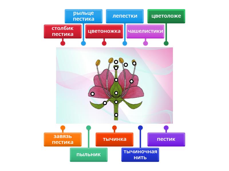 рыльце пестика, столбик пестика, завязь пестика, цветоложе, чашелистики, тычиночная нить, пыльник, тычинка, пестик, лепестки, цветоножка.