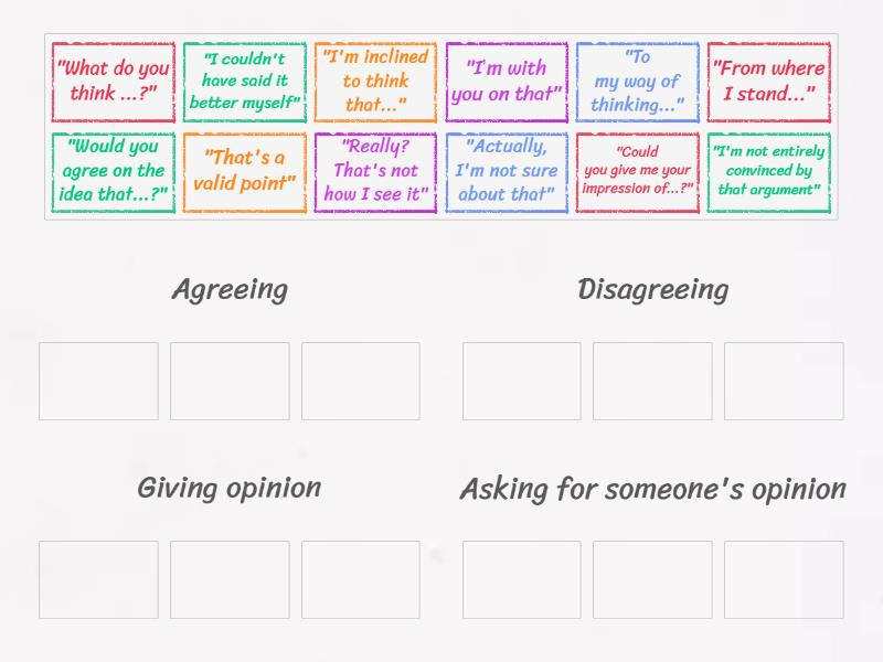 Agreeing: "I’m with you on that", "That's a valid point", "I couldn't have said it better myself", Disagreeing: "I'm not entirely convinced by that argument", "Really? That's not how I see it", "Actually, I'm not sure about that", Giving opinion: "From where I stand...", "To my way of thinking...", "I'm inclined to think that...", Asking for someone's opinion: "What do you think ...?", "Would you agree on the idea that...?", "Could you give me your impression of...?",