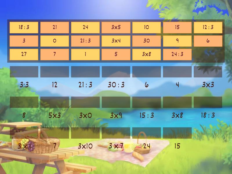 15 - 5х3, 9 - 3х3, 3х4 - 12, 24 - 3х8, 3х5 - 15, 27 - 3х9, 3х8 - 24, 30 - 3х10, 6 - 18 : 3, 24 : 3 - 8, 7 - 21 : 3, 18 : 3 - 6, 5 - 15 : 3, 21 : 3 - 7, 10 - 30 : 3, 12 : 3 - 4, 0 - 3х0, 1 - 3:3, 3 - 3 х 1, 21 - 3 х 7,