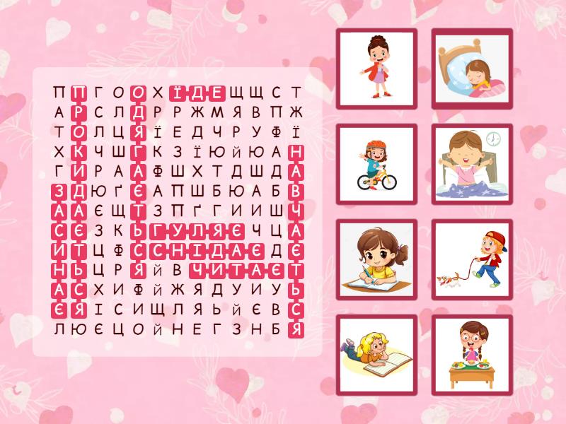 прокидається, снідає, одягається, їде, навчається, гуляє, читає, засинає,