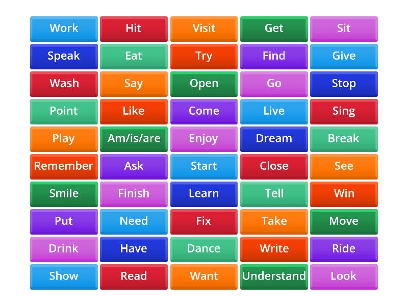 Drink - Drank, Start - Started, Work - Worked, Move - Moved, Play - Played, Close - Closed, Dream - Dreamed, Ask - Asked, Fix - Fixed, Finish - Finished, Smile - Smiled, Am/is/are - Was/were, Say - Said, Put - Put, Take - Took, Come - Came, Sit - Sat, Have - Had, Get - Got, Write - Wrote, Go - Went, Look - Looked, Understand - Understood, Visit - Visited, Enjoy - Enjoyed, See - Saw, Break - Broke, Read - Read, Try - Tried, Eat - Ate, Find - Found, Give - Gave, Hit - Hit, Learn - Learned, Ride - Rode, Tell - Told, Sing - Sang, Speak - Spoke, Want - Wanted, Need - Needed, Win - Won, Point - Pointed, Stop - Stopped, Wash - Washed, Live - Lived, Like - Liked, Open - Opened, Dance - Danced, Remember - Remembered, Show - Showed,